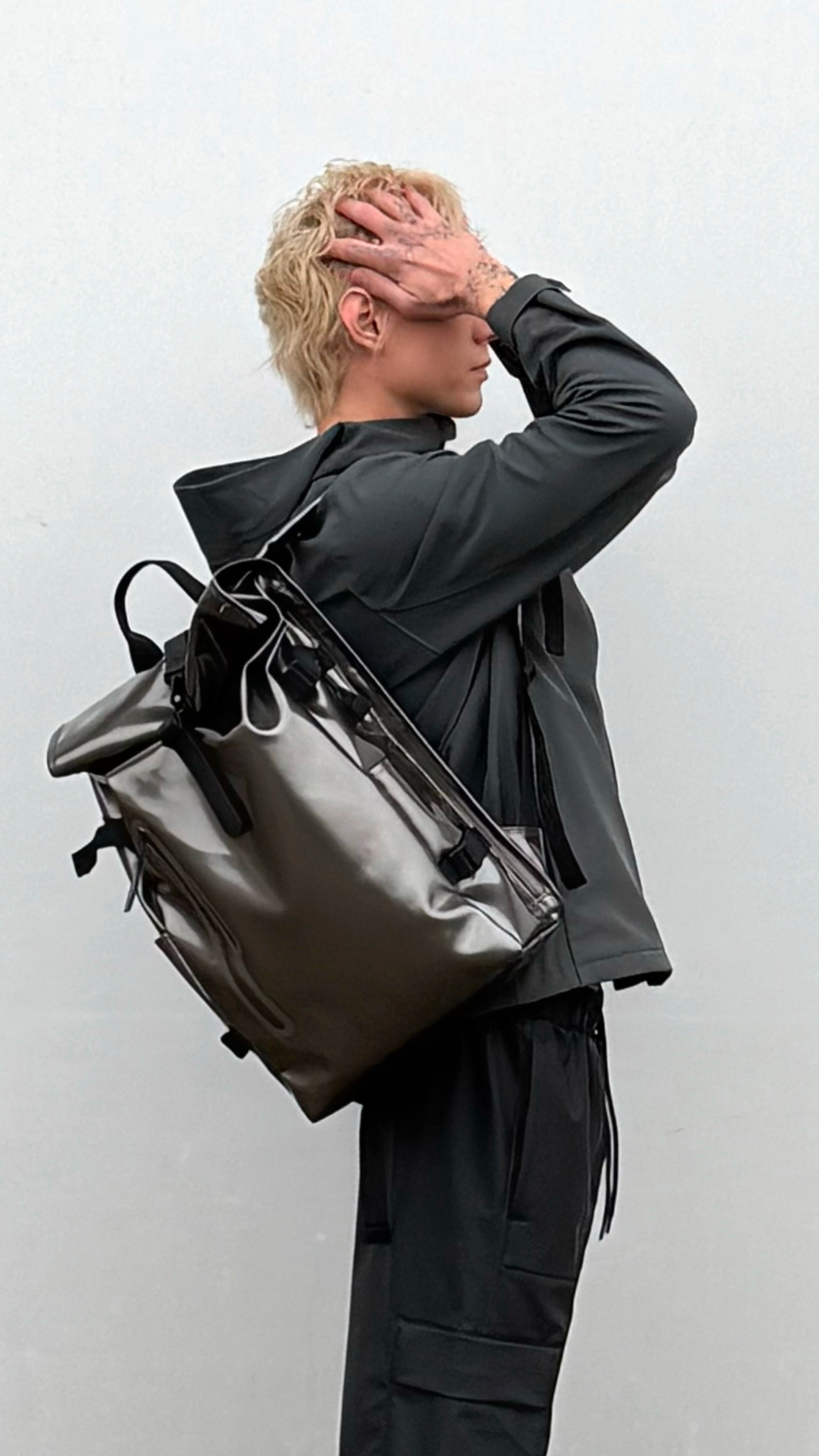 Rolltop Rucksack Large est confectionné en tissu PU emblématique et imperméable de Rains, offrant une résistance et une durabilité optimales pour un toucher ultra-doux.