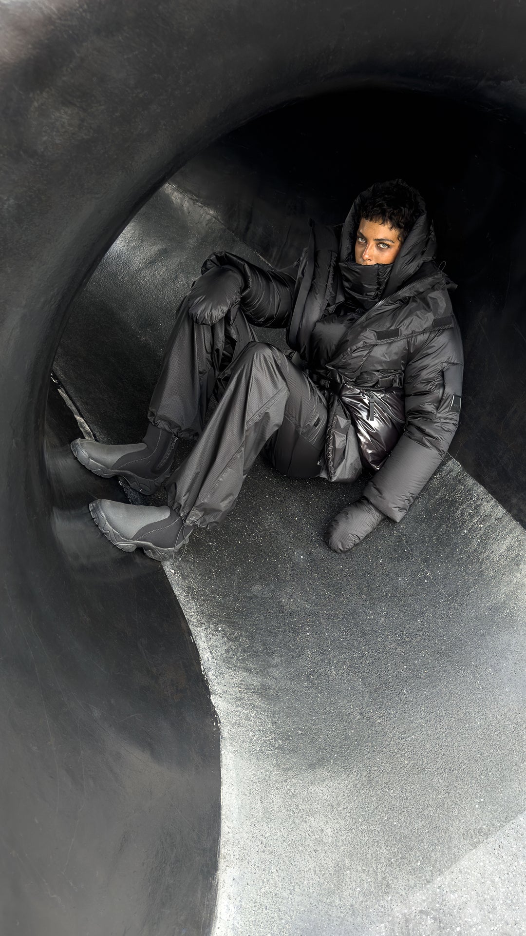 Ce modèle est composé d'une épaisseur supérieure ample en nylon ripstop. Sa silhouette est complétée par une finition semi-transparente et mate douce.