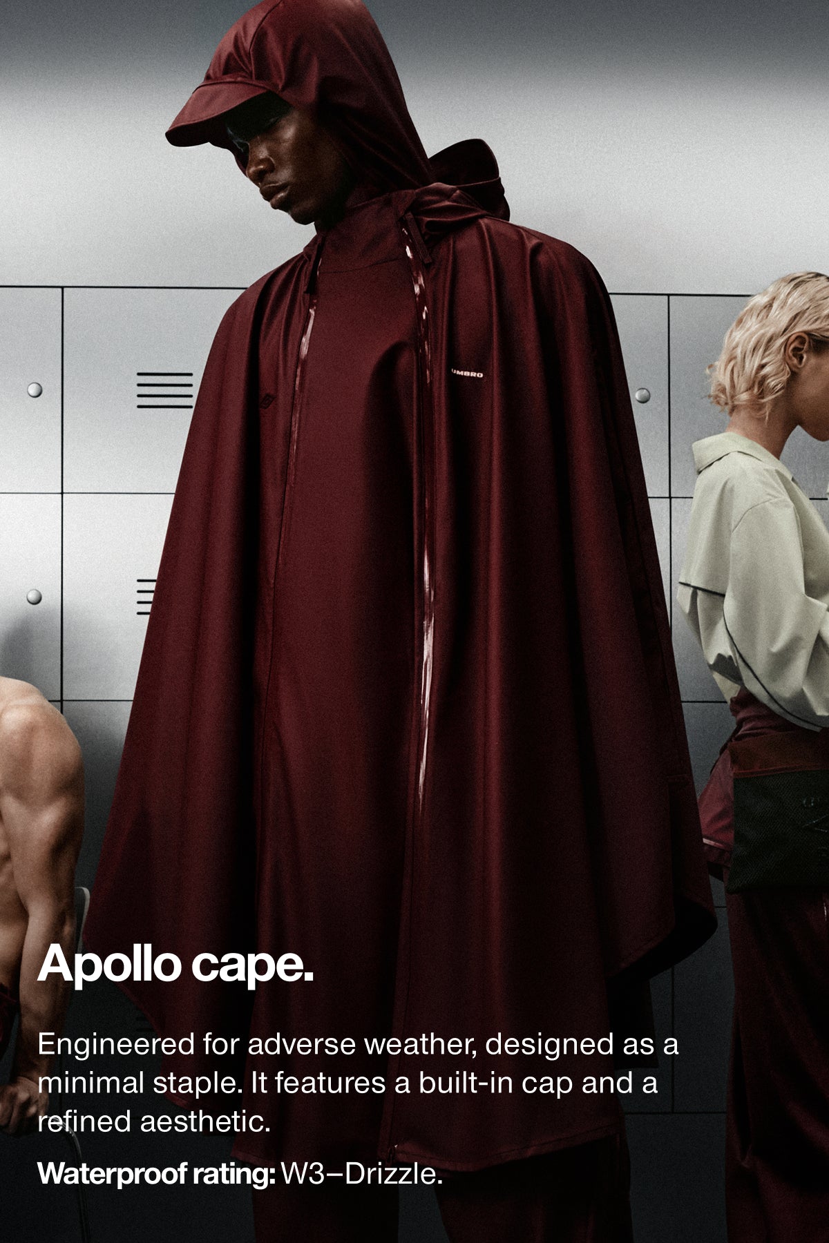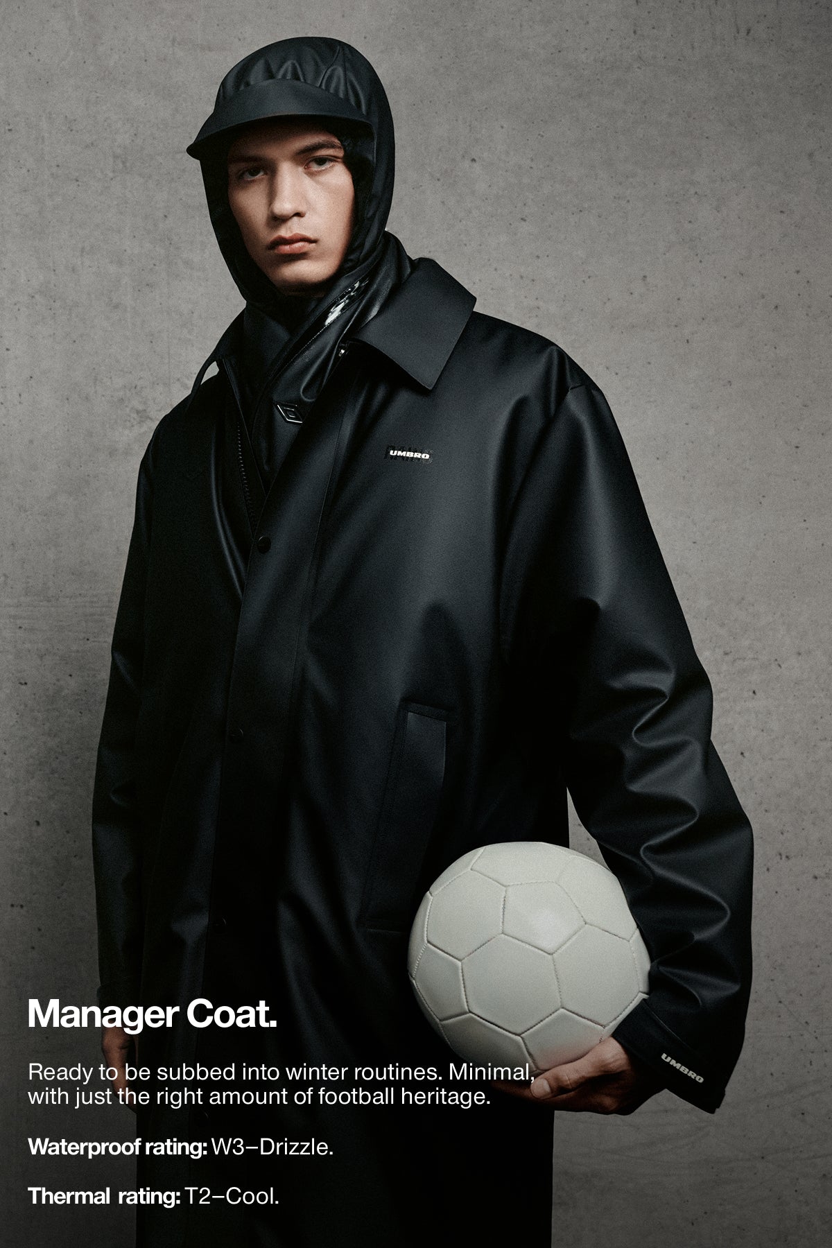 Optimized for both form and function. All designs are cut from our signature lightweight, waterproof PU or our windproof, UV-resistant fabric. Shaped into our sleek, urban silhouettes with a nod to Umbro’s sportswear aesthetic. To be worn off-the-pitch and in the city.