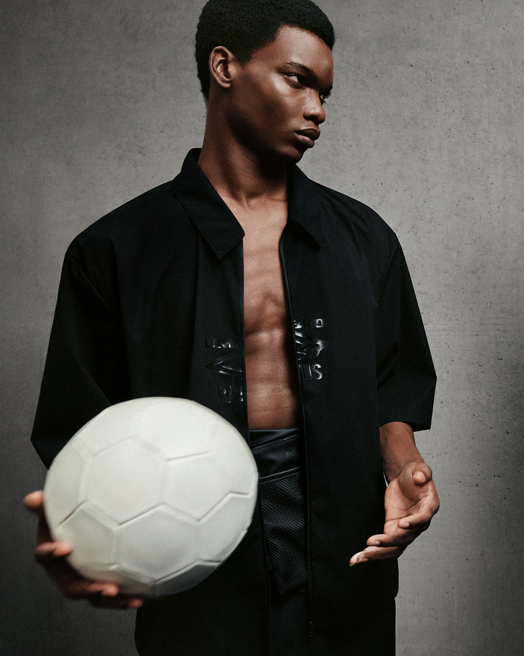 Throughout the collection, catch references to definitive Umbro designs and football archetypes. There’s our interpretation of the iconic collared Drill training top, which became a staple of popular culture in the 90s. Plus, nods to the Umbro Fusion’s exposed stitching and even the surfaces of footballs.
